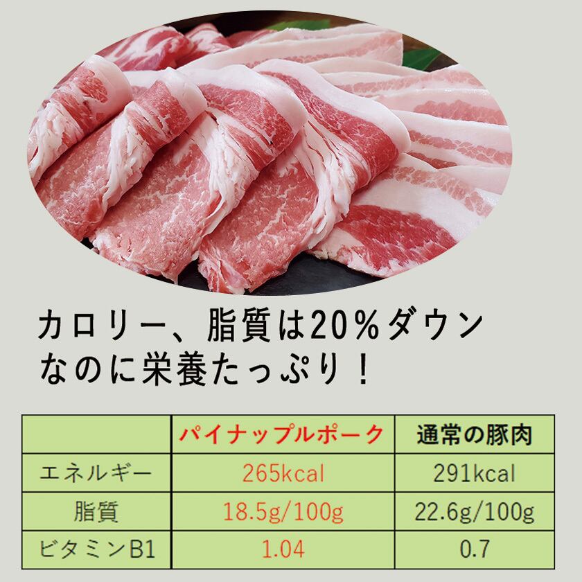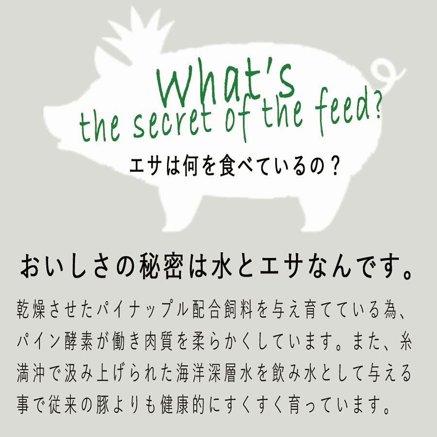 その名の通り、エサに沖縄産のパイナップル粕を配合して育てた豚肉で、ほんのり甘みのある脂と、きめ細かく柔らかい肉質が特長です。